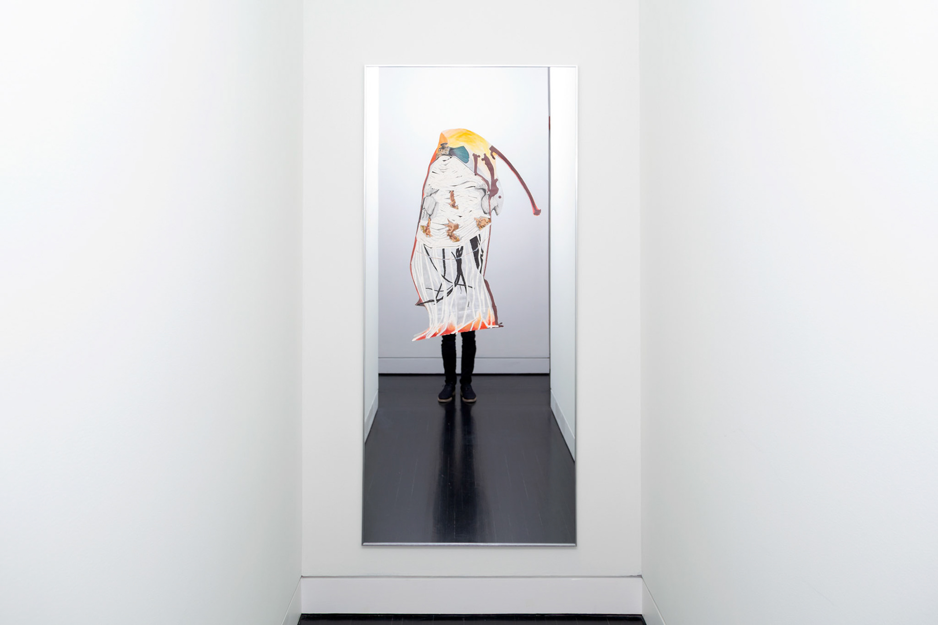 a swallow, 2020, 74" x 64". Oil, acrylic, steel, leather, canvas, satin and pigment.