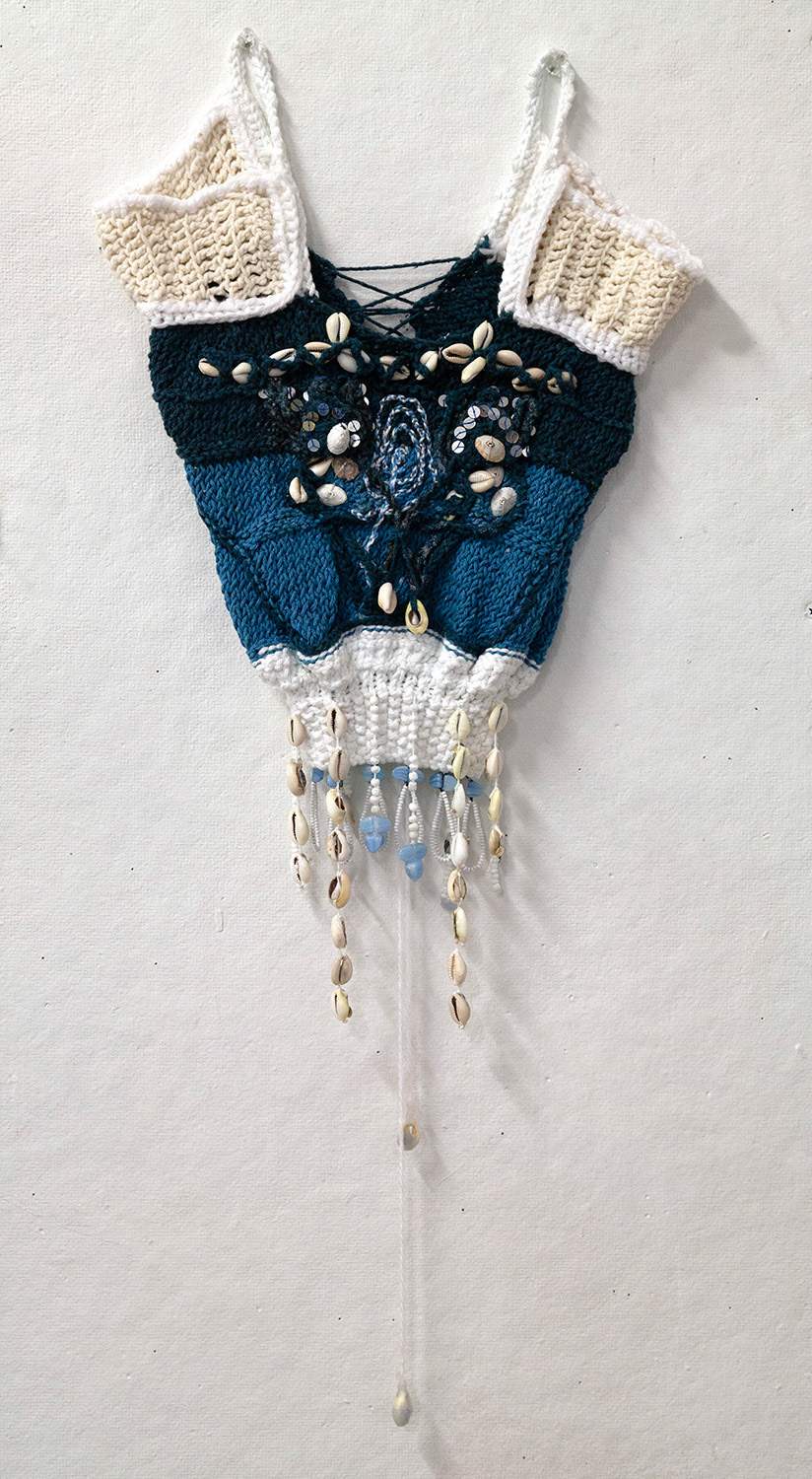 mask i (Yemaya), 2022, 14" x 10". Cotton, seashells, sequins, and wax.