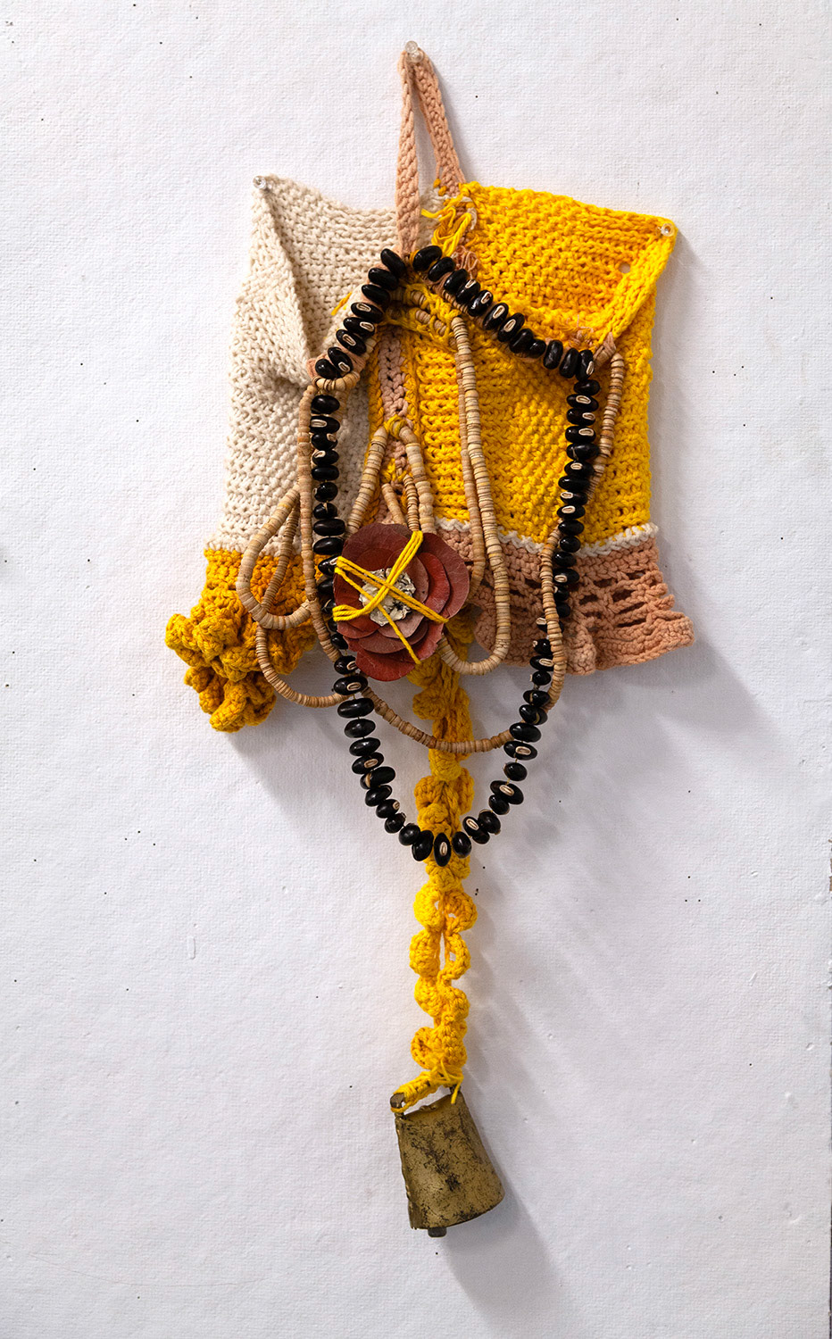 mask ii (Oxúm), 2022, 14" x 10". Cotton, beans, eucalyptus pods and leaves, metal bell.
