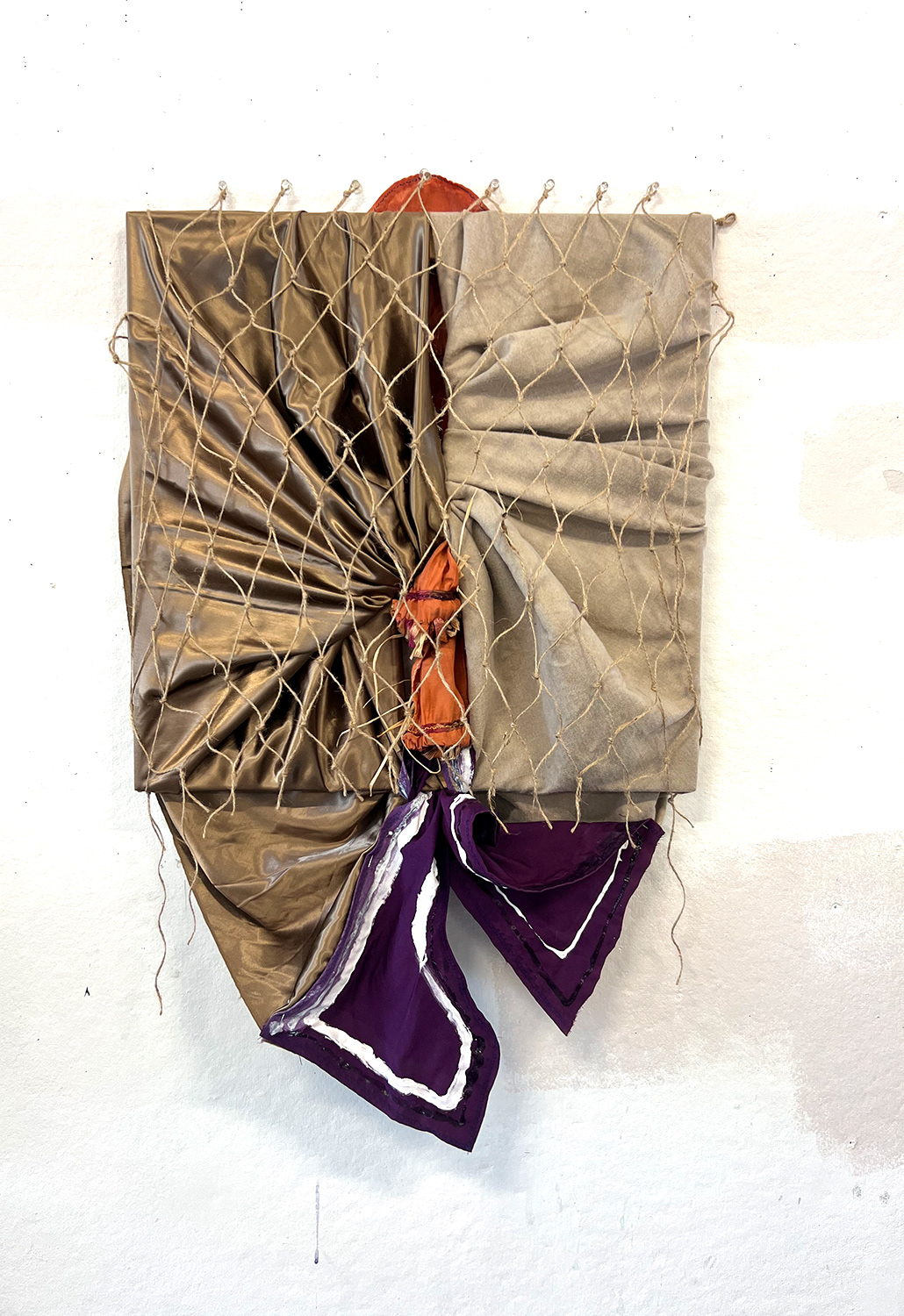 si hay mal, hay bien, 2019, 96" × 72". Oil, acrylic, graphite, spandex and faux suede over fence structure (acrylic paint on wall).