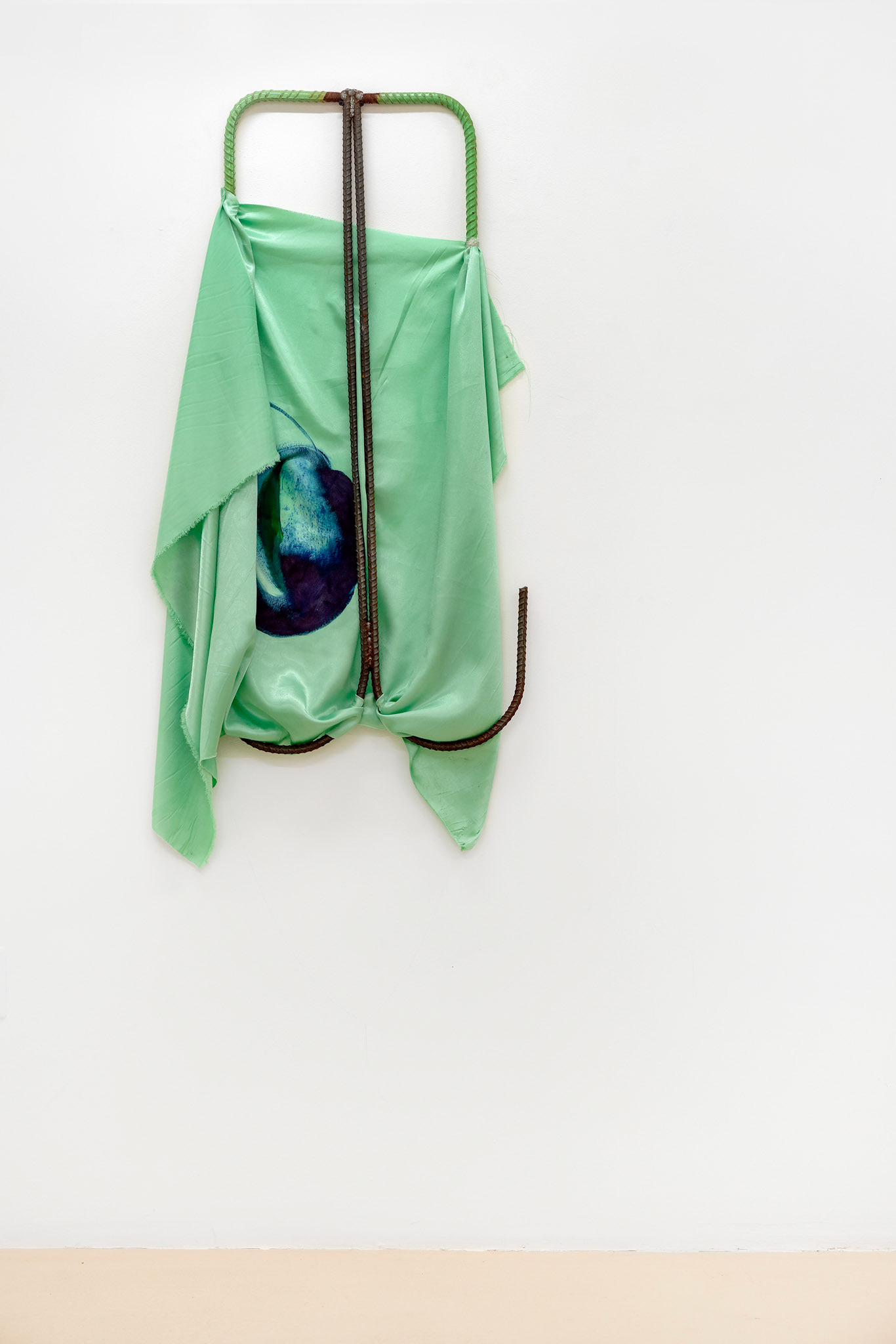 seed and spine, 2019, 46" x 32". Oil and satin over re-bar structure.